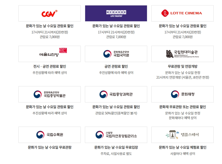매달 마지막 수요일과 그 주간에 영화관, 공연장, 박물관, 미술관, 문화재, 스포츠 시설등 전국 2천여 개 이상의 문화시설을 무료관람 또는 할인혜택을 주어 개인의 문화향유 기회를 제공하고 있습니다.